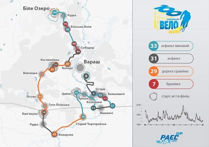 СТАРТ - Пристанційна площа РАЕС (Вараш) – Острів – Балаховичі – Козлиничі – Хряськ – Цміни (КП1) – Старий Чорторийськ – Комарове – Рудка – Камянуха (КП2) – Гута-Лісівська – Лісове – Вовчицьк – Костюхнівка (КП3) – Колодії – Собіщиці - Більська Воля (КП4) – Рудка – ФІНІШ – Реабілітаційно-оздоровчий комплекс «Біле озеро».